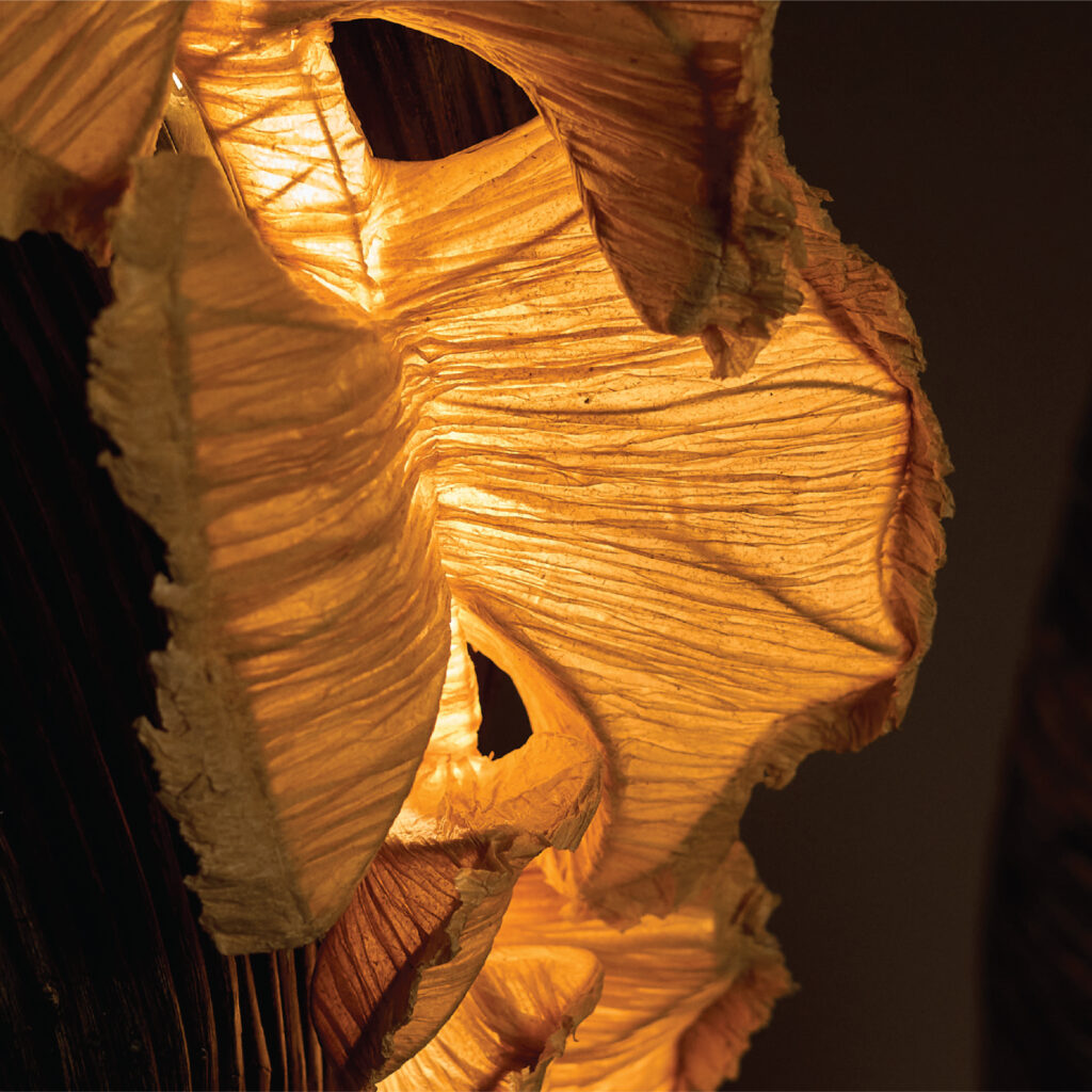 The Fantastic Fungi Lamp captivates with its interplay of form, texture, and light. Crafted from handmade banana fibre paper and reclaimed lantana wood, it features layered curves, hidden folds, and an earthy elegance reminiscent of forest fungi. Its rich, dark-toned external structure contrasts beautifully with the soft amber glow filtering through organically shaped banana fibre accents. The materials heighten the lamp’s tactile appeal—banana fibre paper offers featherlight, rippled translucence, while lantana wood adds depth, grounding, and natural variation.